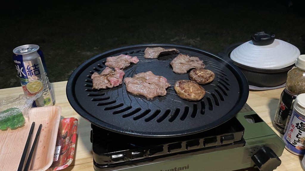 キャンプと言えばバーベキューということで、牛タンと椎茸も。