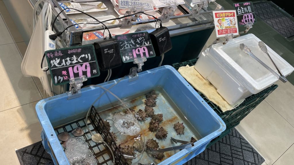 特にキャンプ用のセットは売っていないスーパーですが、海鮮も豊富だったので、食材はすべてここで買ってもいいかと思います。