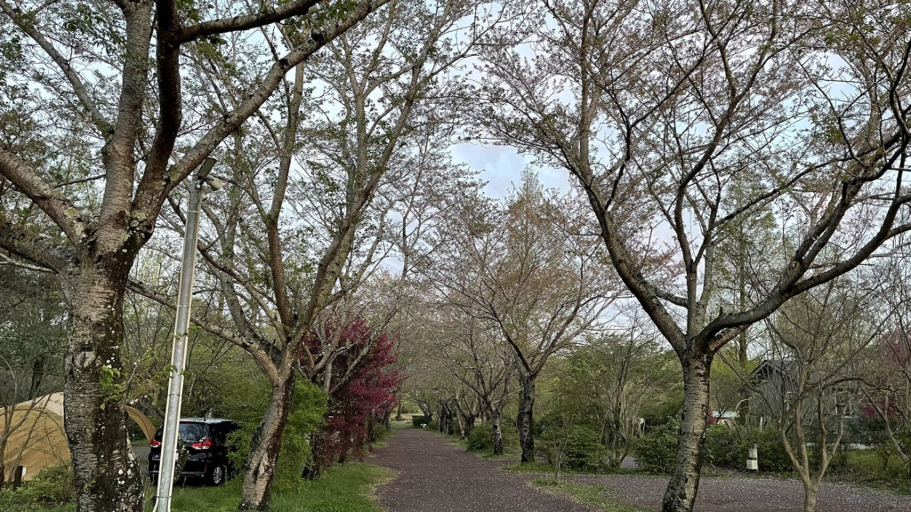 桜の木が多く植えられていて、春先には花見も楽しめるキャンプ場みたいですが、私たちが行ったのは桜が散った後・・・(涙)